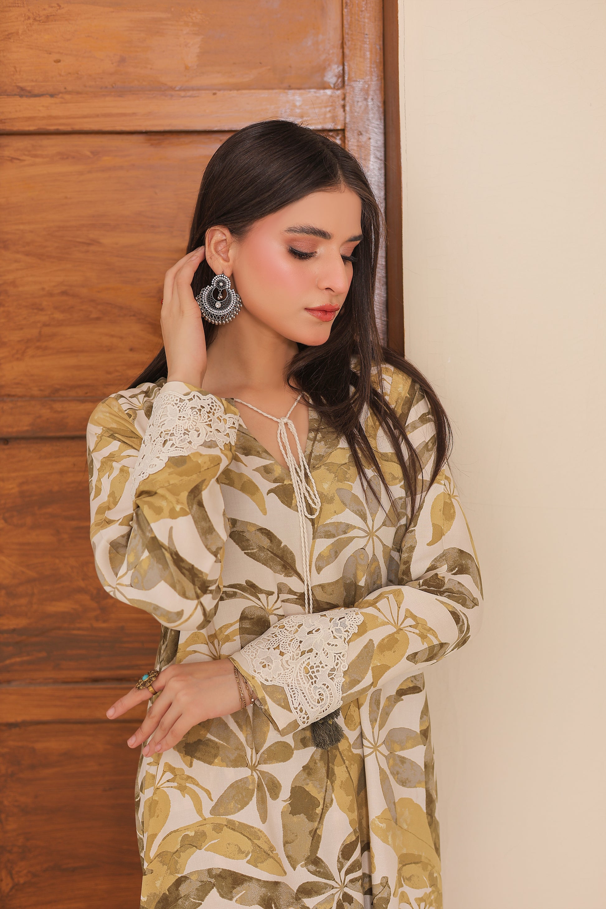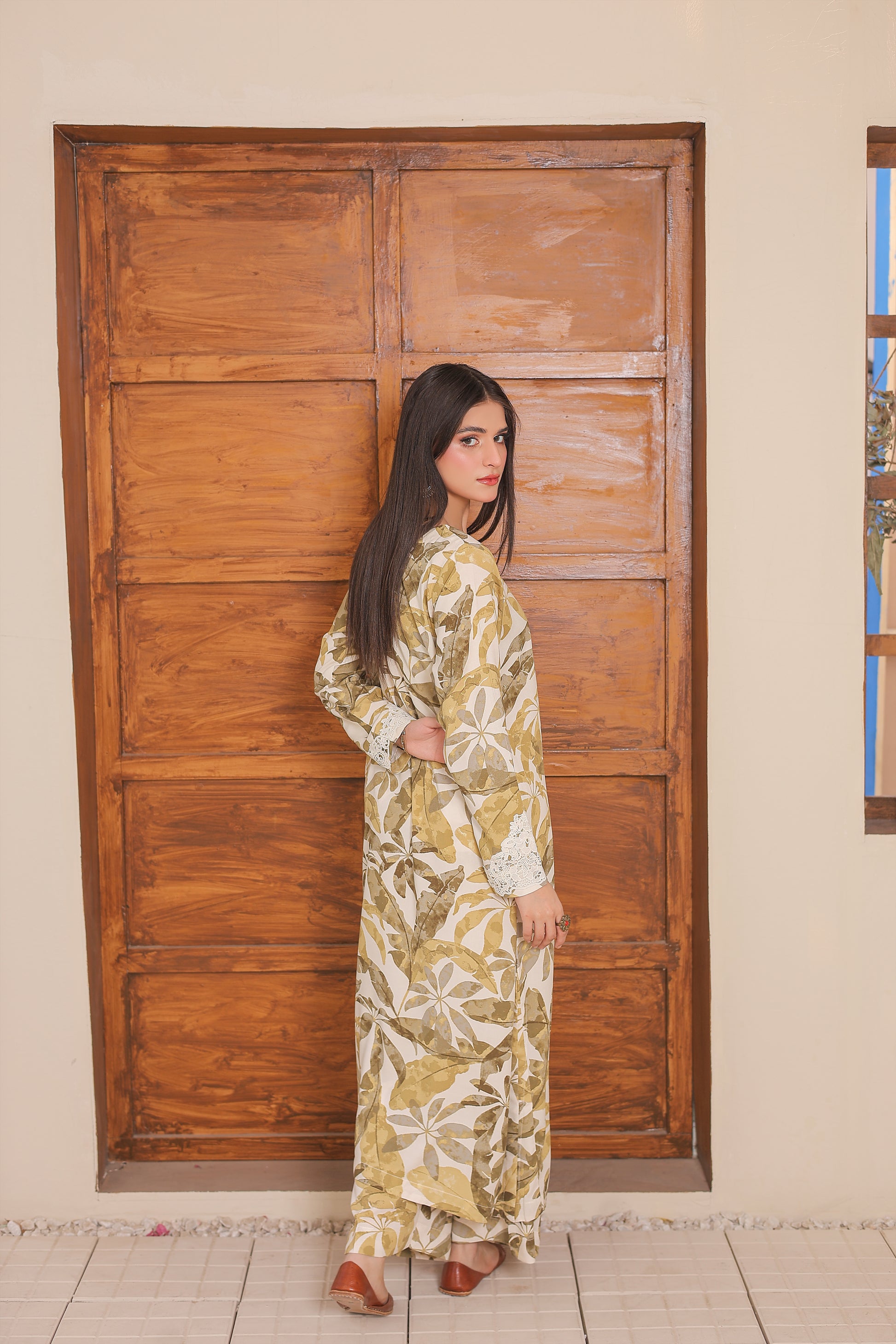 Stitched Long Straight A-line kurta. paired with matching trouser. The fabric has an all-over leaf botanical print in shades of green.
