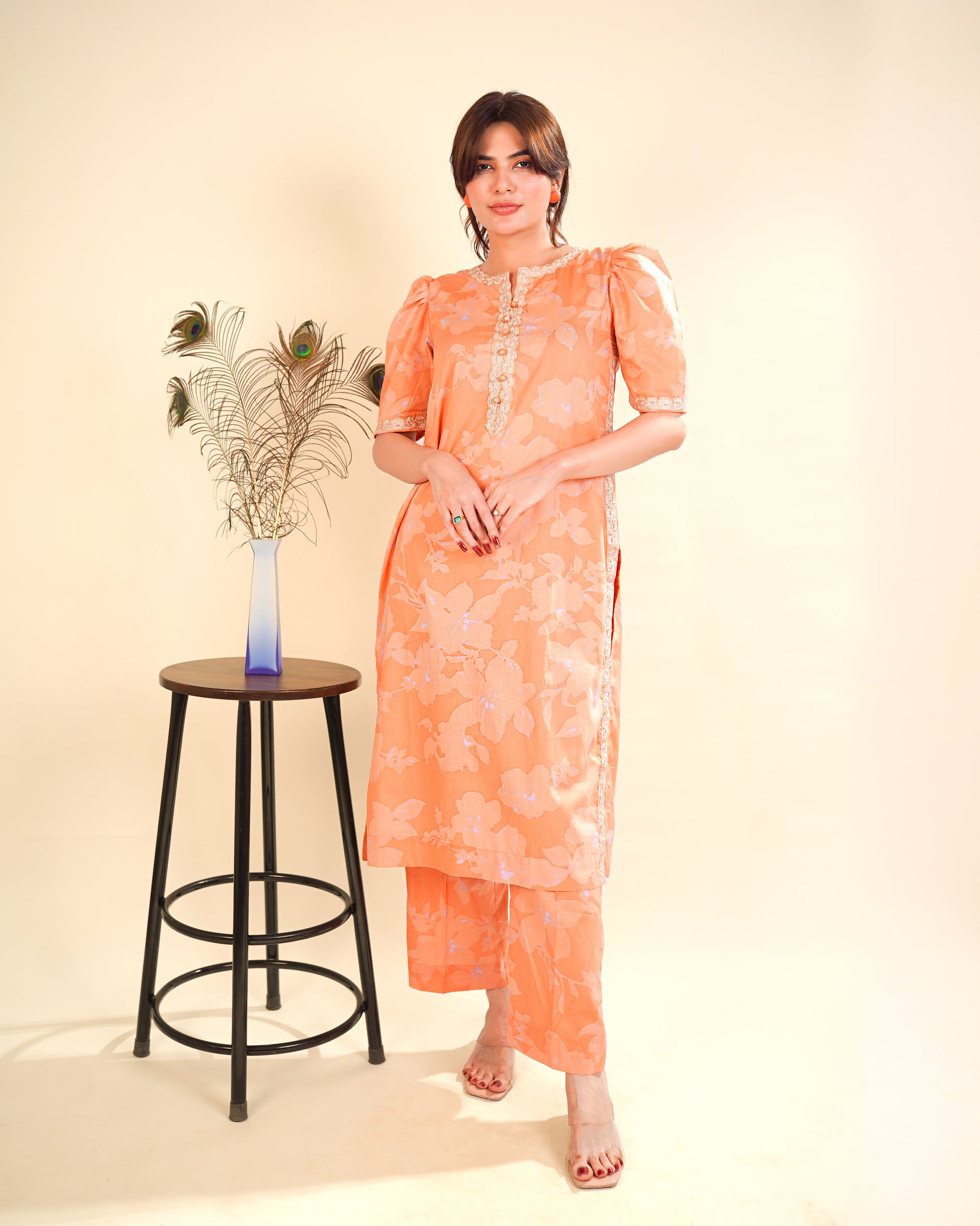 Embellished with intricate lace embroidery and fabric button detailing down the placket, enhancing its formal look.