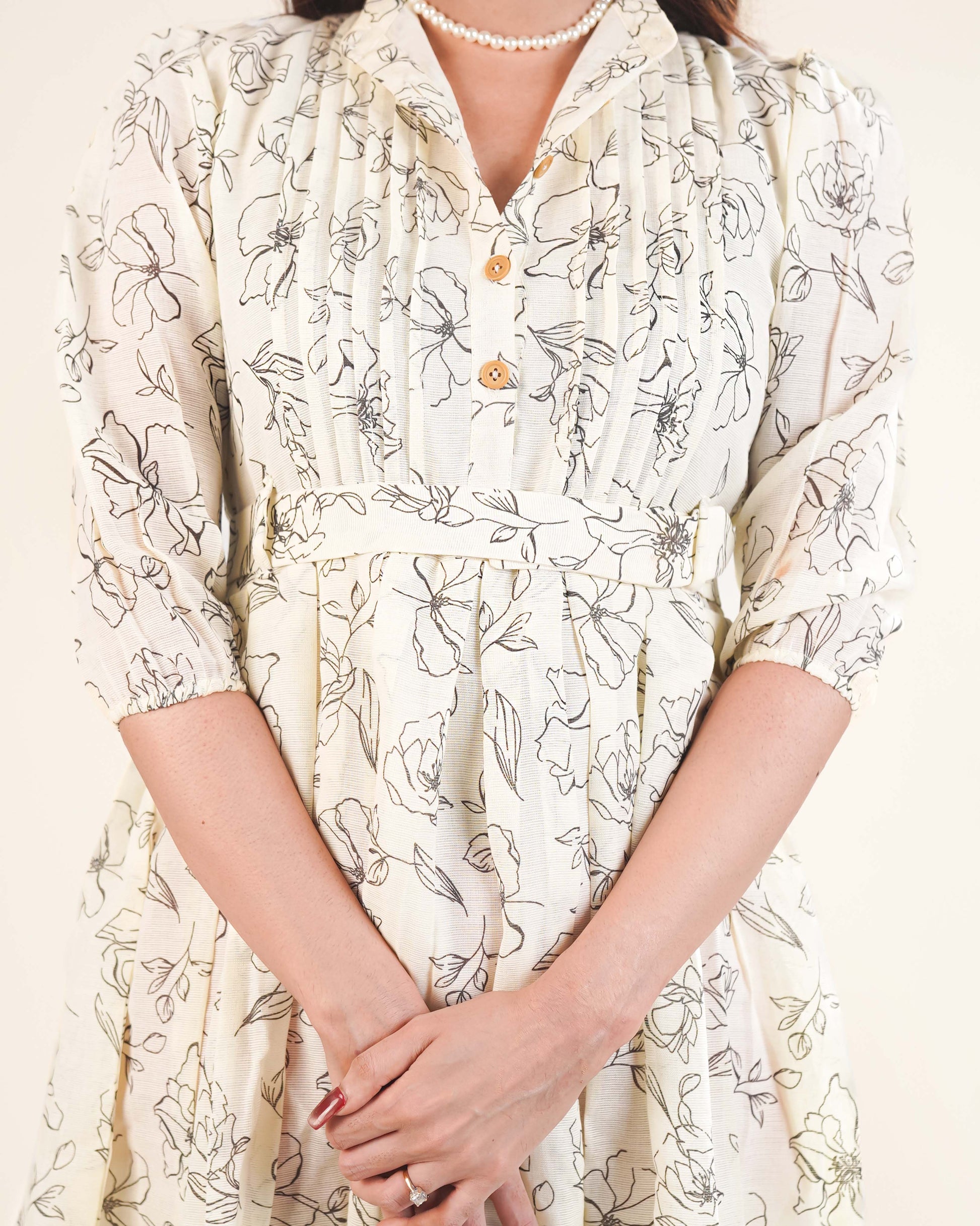 The image shows a woman wearing a long, flowy dress with a floral pattern. It features a v-neckline, buttons down the front, and three-quarter sleeves. Black floral line-art print (roses and leaves) all over the fabric. Defined with a belt-like fabric band, creating a cinched waist effect. Full and flowy with soft pleats, giving volume and movement. Three visible buttons at the top, likely decorative, in a light golden or wooden tone. V-Neckline with band ,button front Undetachable Belt Fitted Bodice.