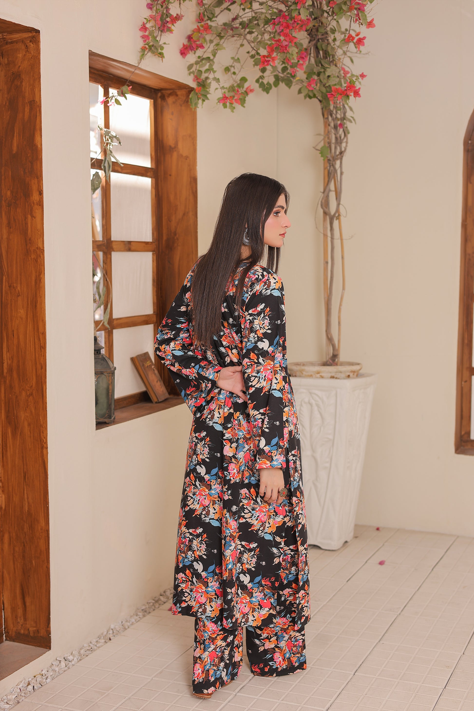 Stitched paired with matching trouser.Black base long dress/kurta with a vibrant multi-colored floral print. The print includes shades of pink, blue, orange, and green.