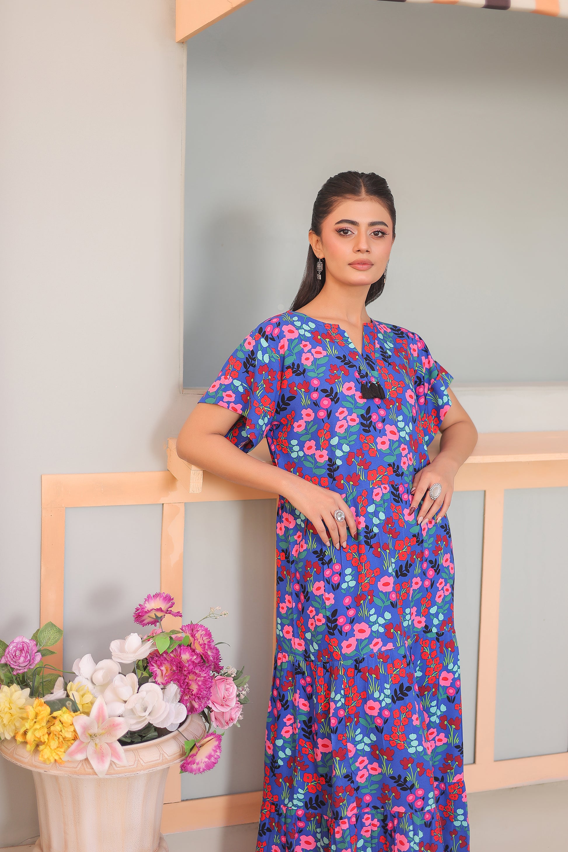 Long maxi Frock ,It features create a flowing, ruffled effect .relaxed, breezy fit, making it ideal for casual wear.